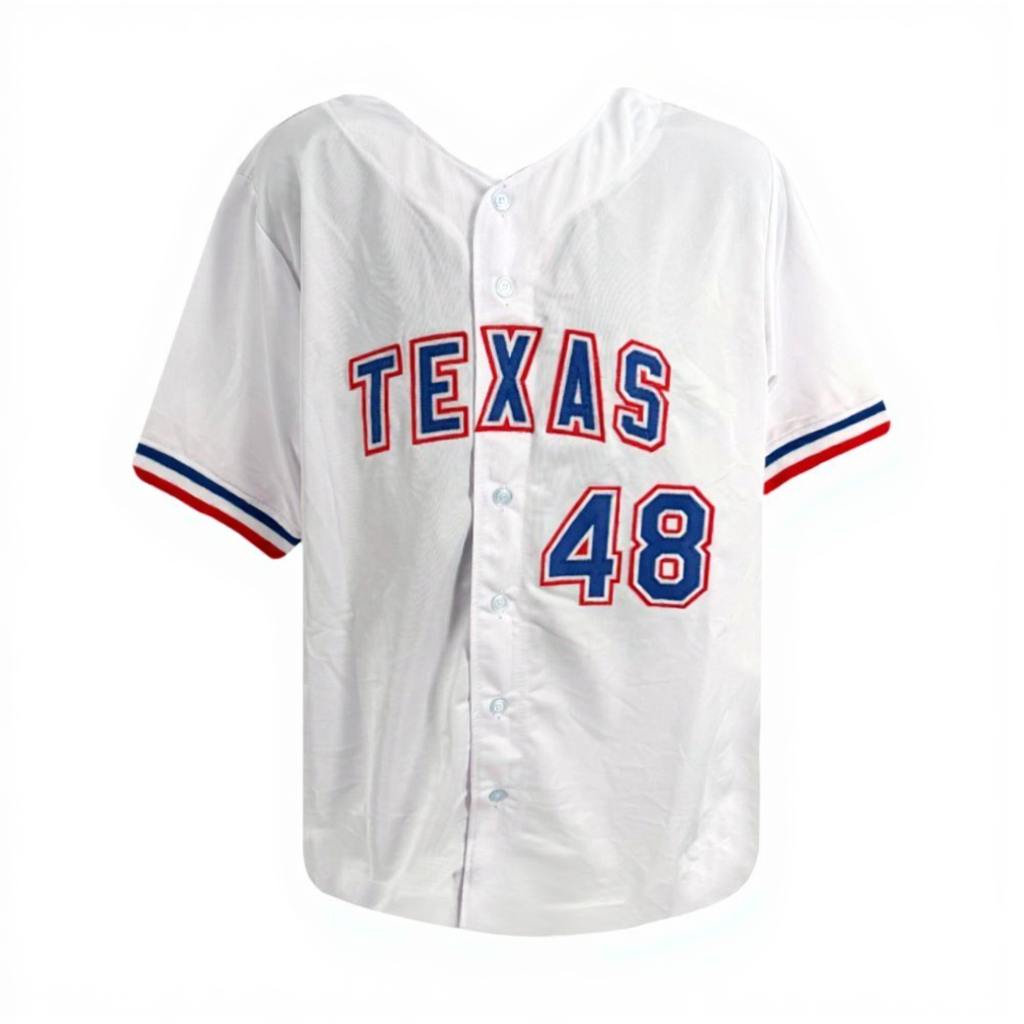 This custom white Texas Rangers jersey features bright red-and-blue stitched numbers and classic Rangers styling. deGrom’s bold signature displayed across the back number makes this a standout piece ideal for framing, fan caves, or memorabilia displays.