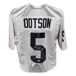 Add one of Penn State’s most electrifying playmakers to your memorabilia collection with this Jahan Dotson Autographed Custom White Nittany Lions Jersey. Dotson became a fan favorite for his elite route running, reliable hands, and clutch performances during his standout career at Penn State before becoming a first-round NFL draft pick.