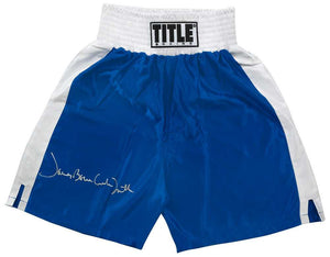 James 'Bonecrusher' Smith signed Title blue with white trim boxing trunks. Item comes with a Schwartz Sports Memorabilia tamper-proof hologram and Certificate of Authenticity which can be verified online.
