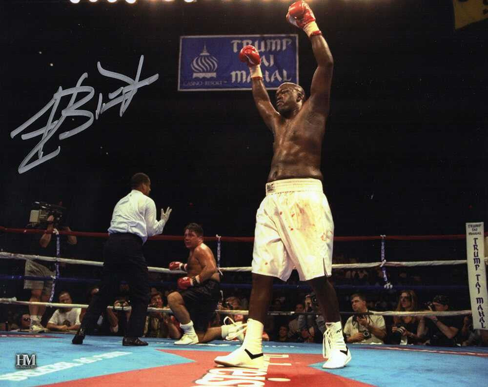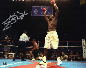 James Buster Douglas signed boxing arms in air white trunks 8x10 photo. Item comes with a Schwartz Sports Memorabilia tamper-proof numbered hologram and Certificate of Authenticity which can be verified online.