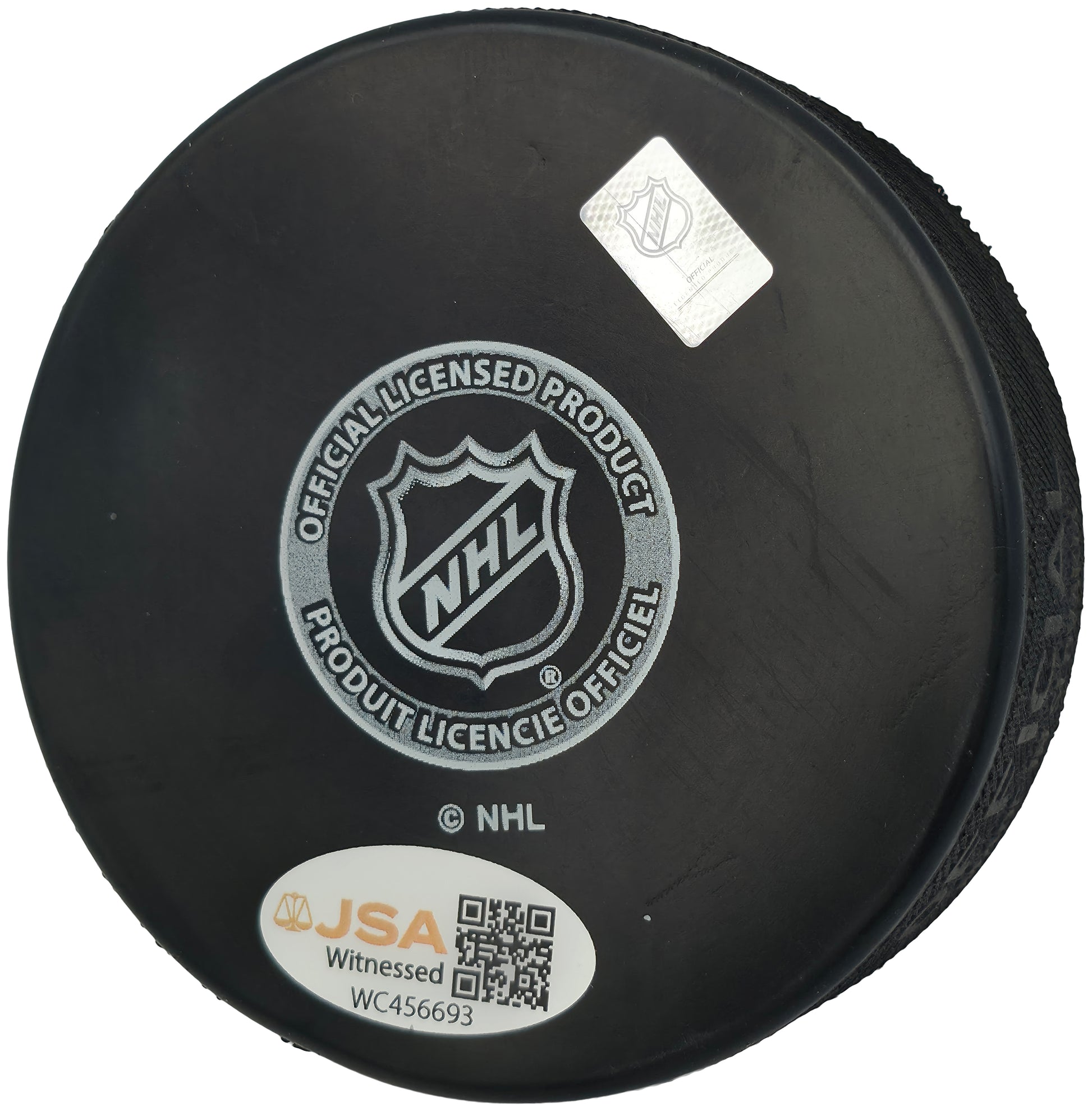 This puck is certified by James Spence Authentication (JSA) at the Witness tier. A JSA representative was physically present at the signing to verify the autograph in real time. The tamper-proof JSA Witness hologram is affixed directly to the puck and verifiable at JSA's official website.