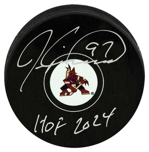 Jeremy Roenick signed Arizona Coyotes logo hockey puck with 'HOF 2024' inscription. Item comes with a Schwartz Sports Memorabilia tamper-proof numbered hologram and Certificate of Authenticity which can be verified online.