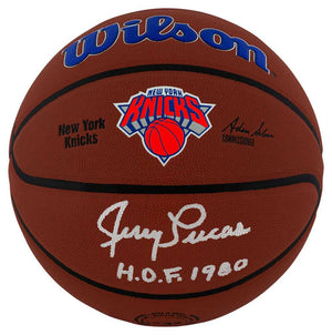 Jerry Lucas signed New York Knicks logo Wilson NBA basketball with 'HOF 80' inscription. Item comes with a Schwartz Sports Memorabilia tamper-proof numbered hologram and Certificate of Authenticity which can be verified online.