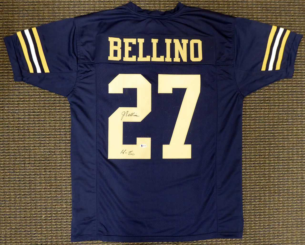 This classic blue custom Navy Midshipmen jersey has been hand-signed by Joe Bellino with a clean autograph and his “H-60” inscription, commemorating his historic Heisman season. The signature is authenticated by Beckett Authentication Services (BAS) and includes a BAS tamper-proof hologram for lifetime verification and collector peace of mind.
