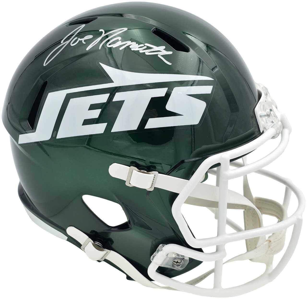 This Riddell Speed Replica Helmet features the 2024 updated Jets green shell with the iconic white logo decals and black facemask. Each helmet is hand-signed by Joe Namath and certified authentic by PSA/DNA, one of the most trusted names in sports memorabilia authentication. It includes a tamper-proof hologram and matching Certificate of Authenticity.