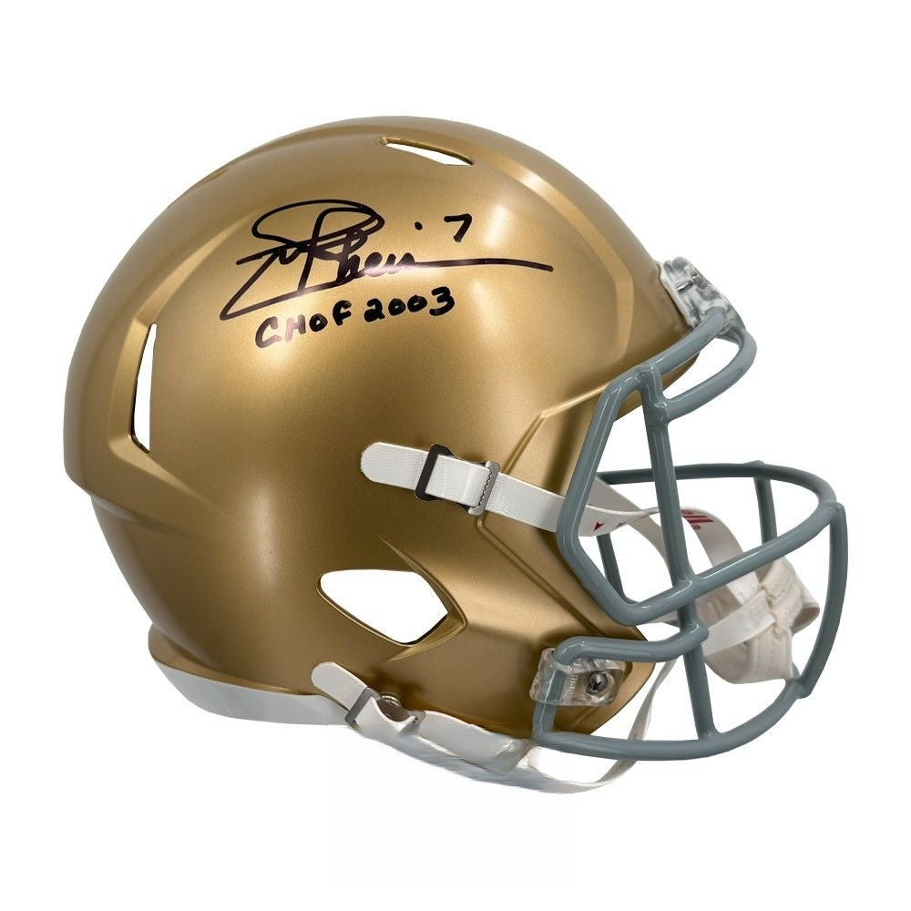 Honor one of Notre Dame’s most accomplished quarterbacks with this Joe Theismann Autographed Notre Dame Fighting Irish 2016 Full Size Riddell Speed Replica Helmet featuring the special inscription “CHOF 2003.” Theismann was a standout star for the Irish before his long NFL career, ultimately earning induction into the College Football Hall of Fame in 2003.