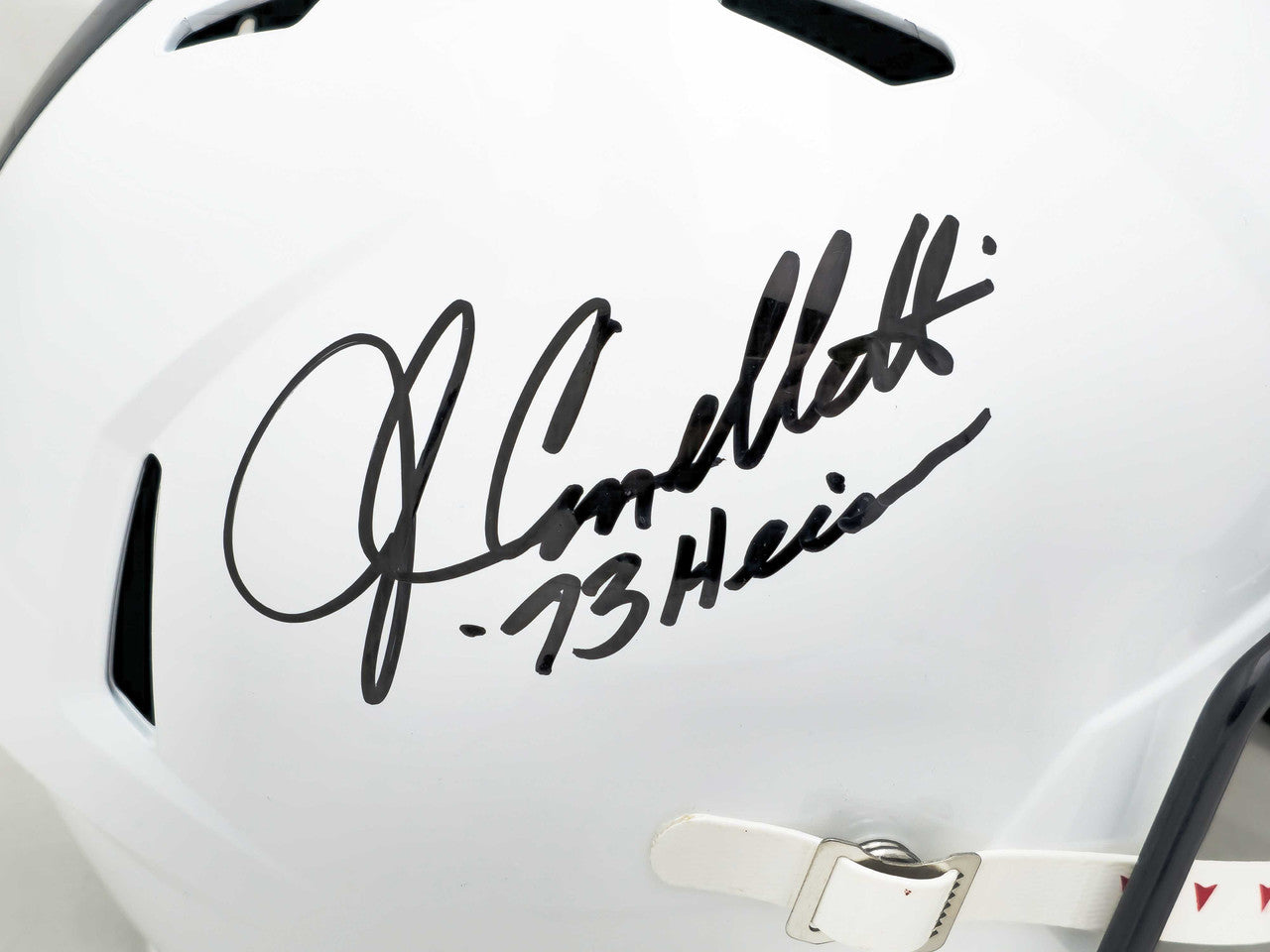 This crisp white full-size Riddell Speed replica helmet showcases the classic Penn State design and has been hand-signed by John Cappelletti along with the inscription “73 Heis.” Authentication is provided by James Spence Authentication (JSA), one of the most respected names in the industry. The helmet includes a JSA tamper-proof hologram and Certificate of Authenticity (COA) for lifetime verification.