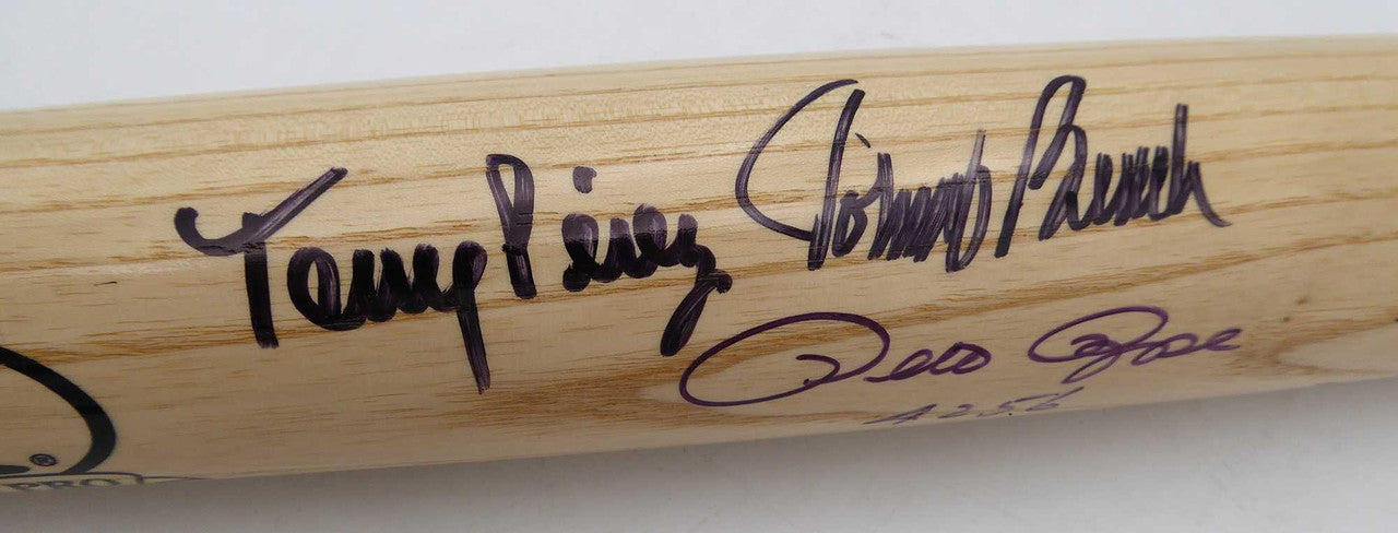 This is a Rawlings Bat that has been hand signed by Johnny Bench, Pete Rose, Tony Perez and Joe Morgan. NOTE: Pete Rose inscribed the bat "4256". This item has been certified authentic by Fanatics and comes with their tamper-proof sticker.