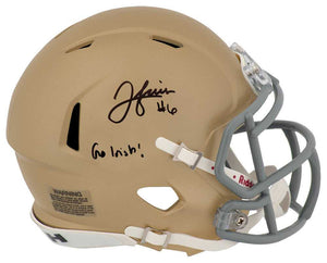Jordan Faison signed Notre Dame Fighting Irish Riddell speed mini helmet with 'Go Irish' inscription. Item comes with a Schwartz Sports Memorabilia tamper-proof numbered hologram and Certificate of Authenticity which can be verified online.