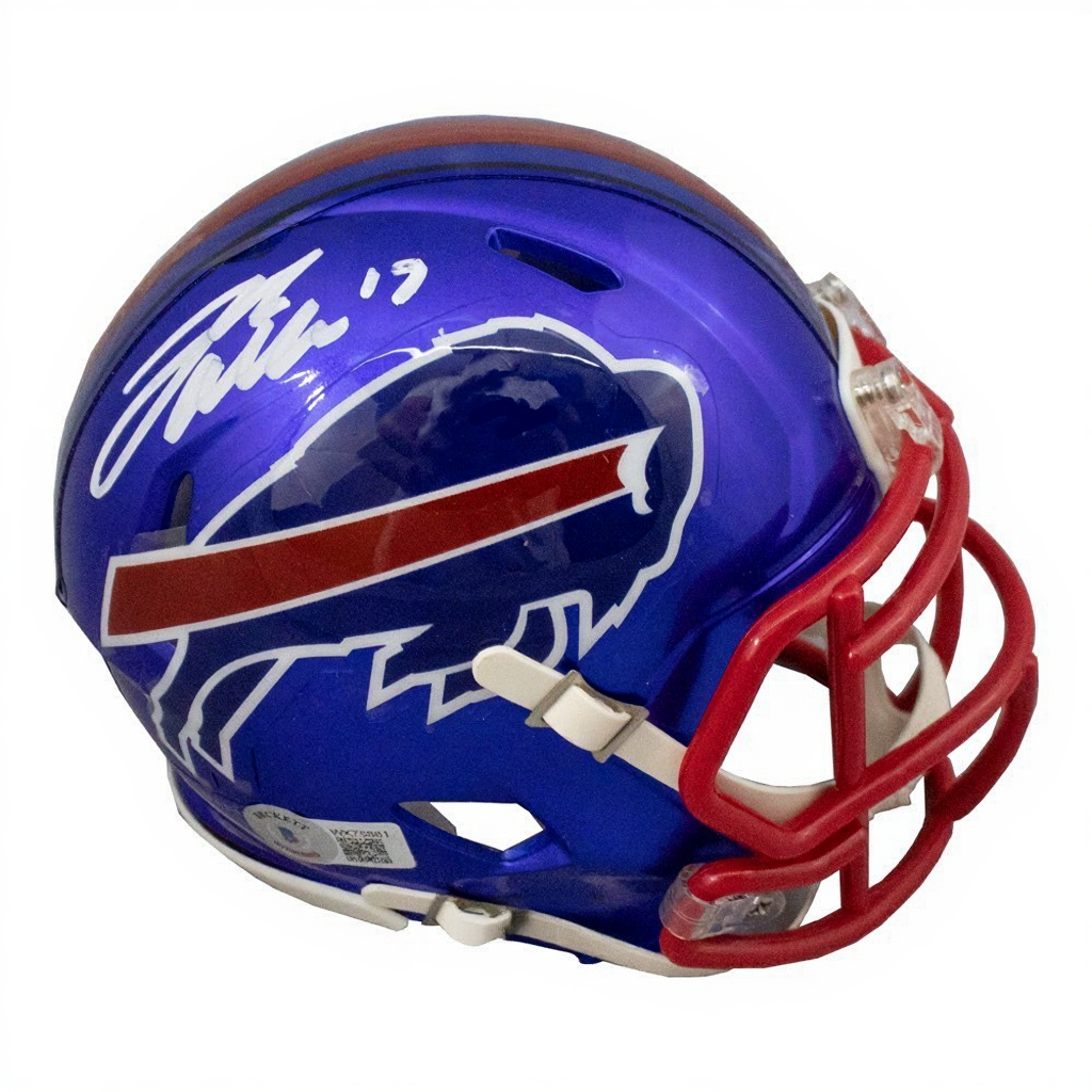 Show off your Buffalo Bills pride with this striking Josh Allen Autographed Buffalo Bills Flash Mini Football Helmet. Featuring Allen’s bold autograph on the vibrant Flash alternate chrome design, this collectible is certified authentic by Beckett Authentication Services (BAS) and is a must-have for every Bills fan and football memorabilia collector.