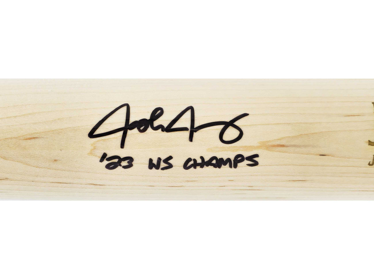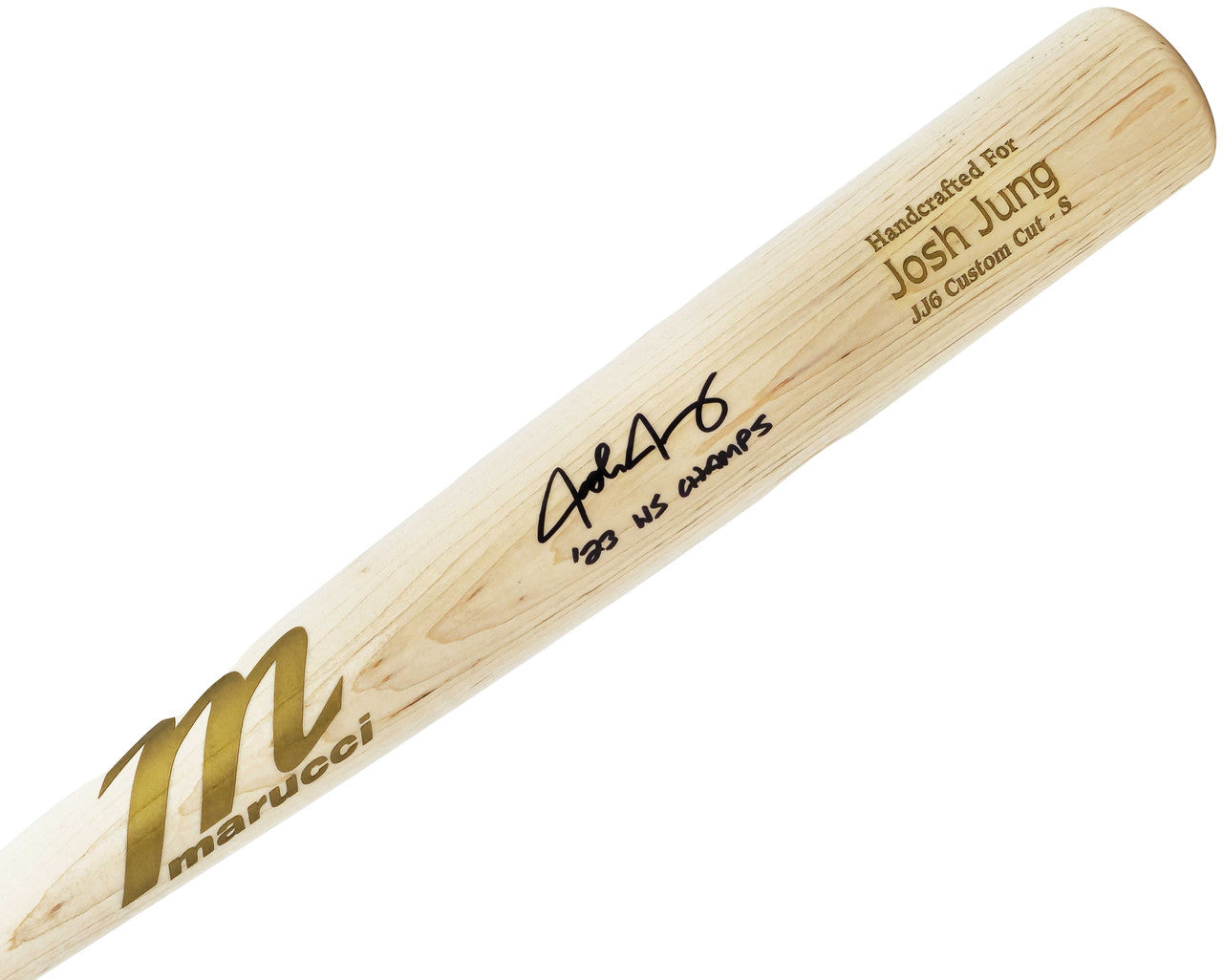 This is a Blonde Marucci Player Model Bat that has been hand signed by Josh Jung. This item was inscribed "23 WS Champs." This item has been witnessed and certified authentic by Beckett Authentication (BAS) and comes with their tamper-proof witness sticker.