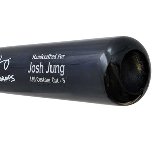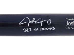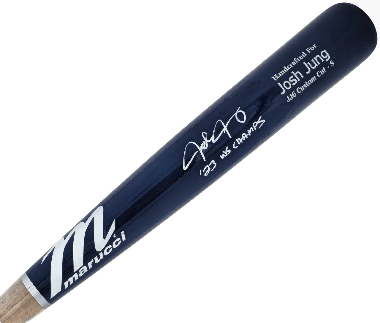 This is a Navy/Grey Marucci Player Model Bat that has been hand signed by Josh Jung. This item was inscribed "23 WS Champs." This item has been witnessed and certified authentic by Beckett Authentication (BAS) and comes with their tamper-proof witness sticker.
