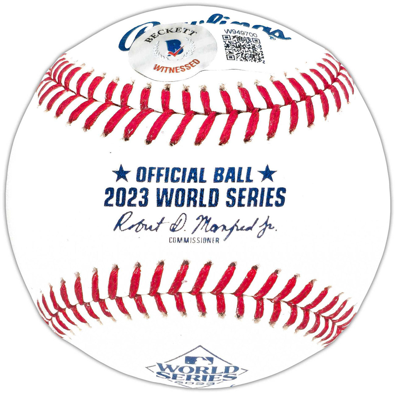 This is an Official 2023 World Series Logo MLB Baseball that has been hand signed by Josh Jung. This item was inscribed "23 WS Champs." This item has been witnessed and certified authentic by Beckett Authentication (BAS) and comes with their tamper-proof witness sticker.