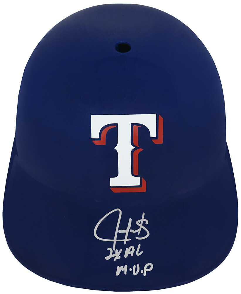 Juan Gonzalez signed Texas Rangers replica souvenir batting helmet with '2x AL MVP' inscription. Item comes with a Schwartz Sports Memorabilia tamper-proof numbered hologram and Certificate of Authenticity which can be verified online.