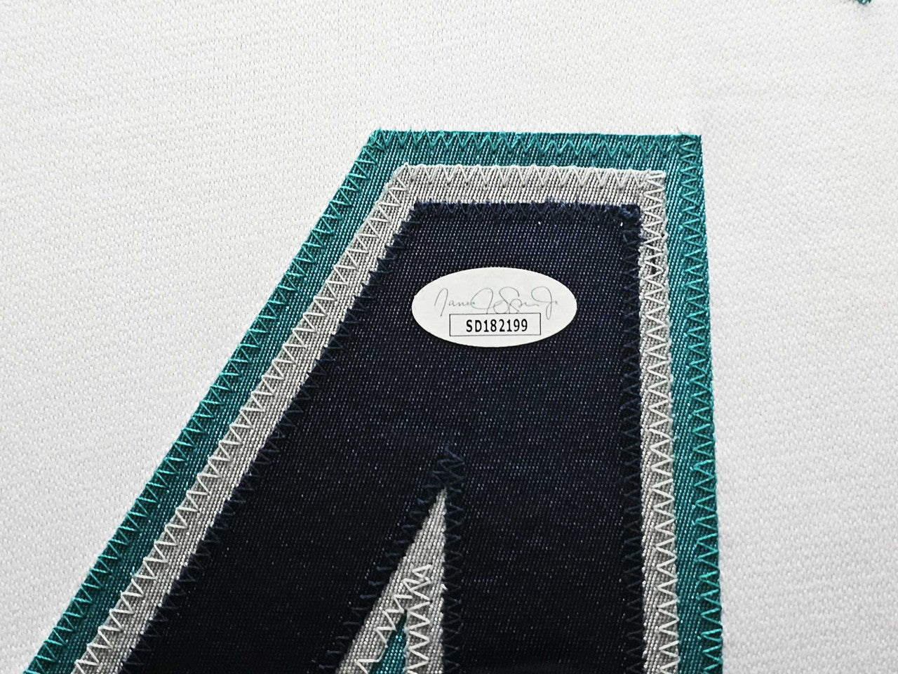 Celebrate the rise of one of baseball’s brightest young stars with this Julio Rodríguez Autographed Seattle Mariners Framed White Jersey, authenticated by JSA (James Spence Authentication). Known as “J-Rod,” Rodríguez has quickly become the face of the Mariners franchise, earning All-Star selections, Rookie of the Year honors, and recognition as one of MLB’s most exciting players. This custom white Mariners jersey, professionally framed at approximately 31x36 inches, has been hand-signed by Julio Rodríguez and comes with a JSA tamper-proof hologram and Certificate of Authenticity. A perfect collectible for Mariners fans and baseball enthusiasts alike.