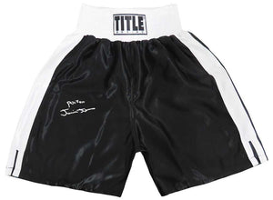 Junior Jones signed Title black with white trim boxing trunks with 'Poison' inscription. Item comes with a Schwartz Sports Memorabilia tamper-proof numbered hologram and Certificate of Authenticity which can be verified online.