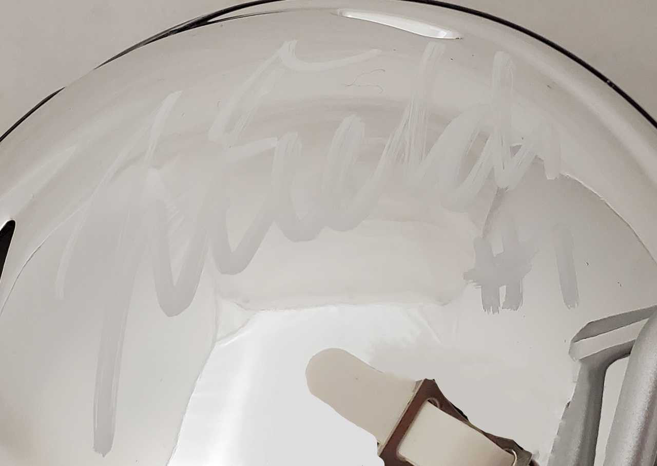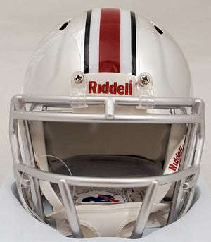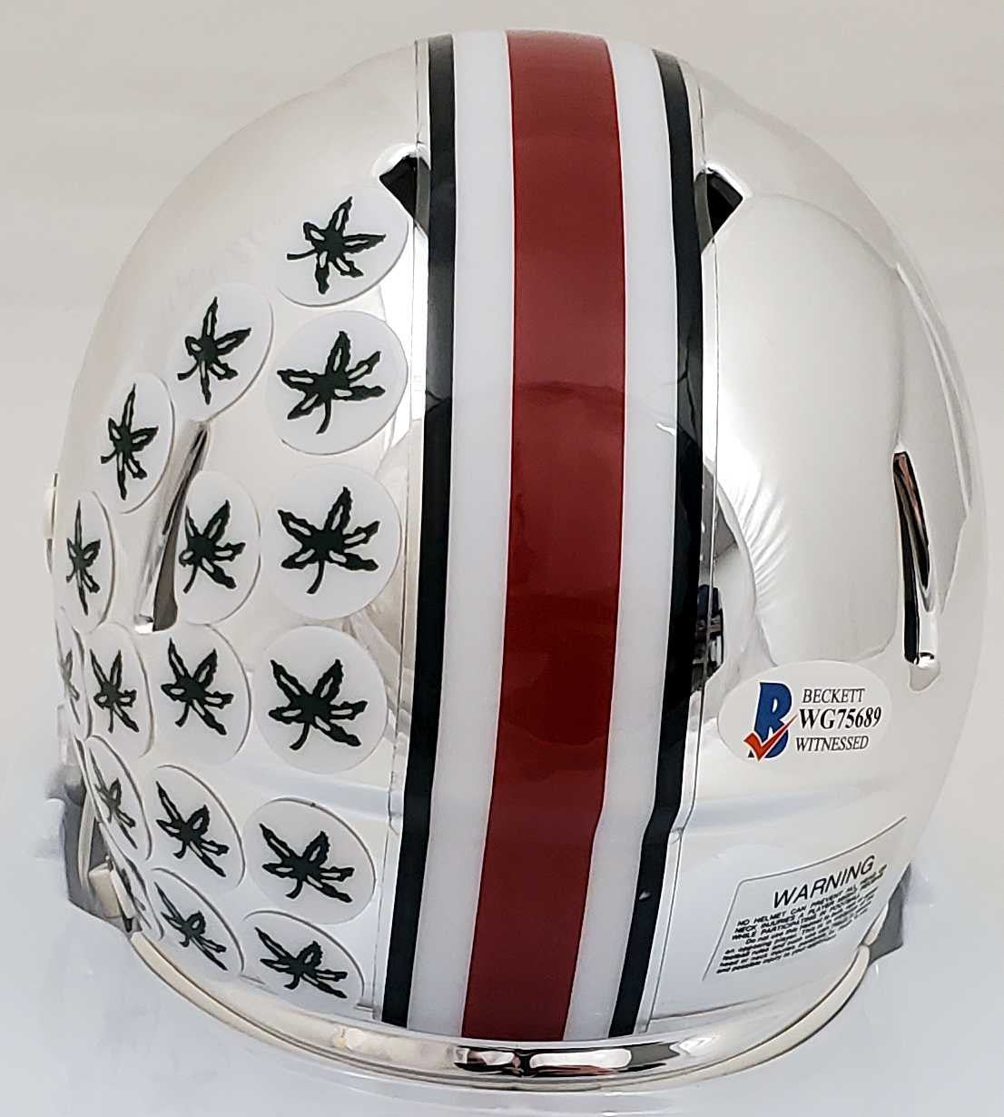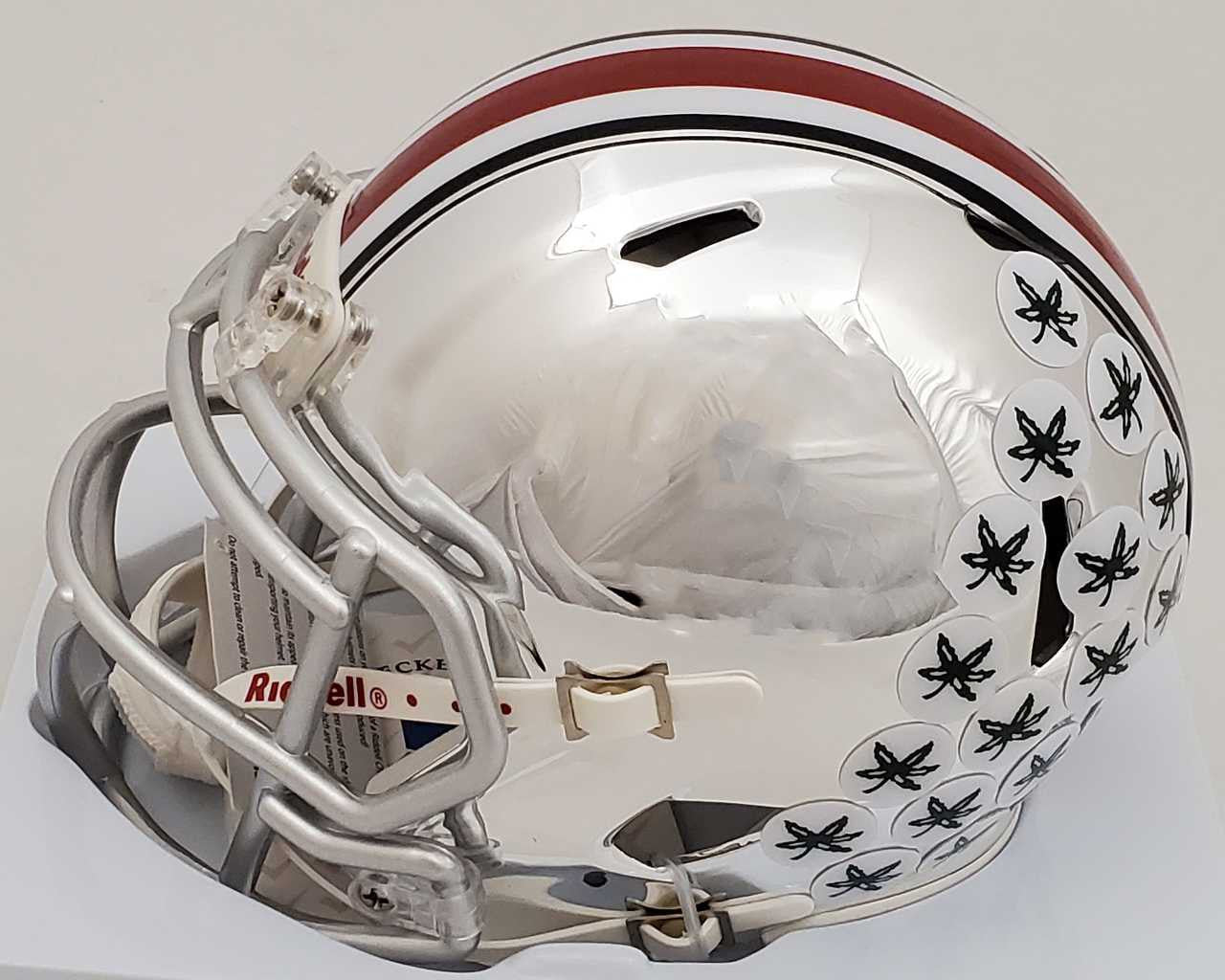 This is an Ohio State Buckeyes Chrome Silver Speed Mini Helmet that has been hand signed by Justin Fields. Please note, this chrome mini helmet is very reflective and displays nicer than what the pictures show. This item has been certified authentic by Beckett Authentication (BAS) and comes with their serial numbered sticker and matching certificate of authenticity.