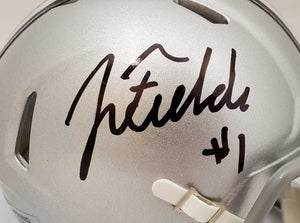 This is an Ohio State Buckeyes Silver Speed Mini Helmet that has been hand signed by Justin Fields. This item has been certified authentic by Beckett Authentication (BAS) and comes with their serial numbered sticker and matching certificate of authenticity.
