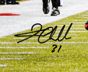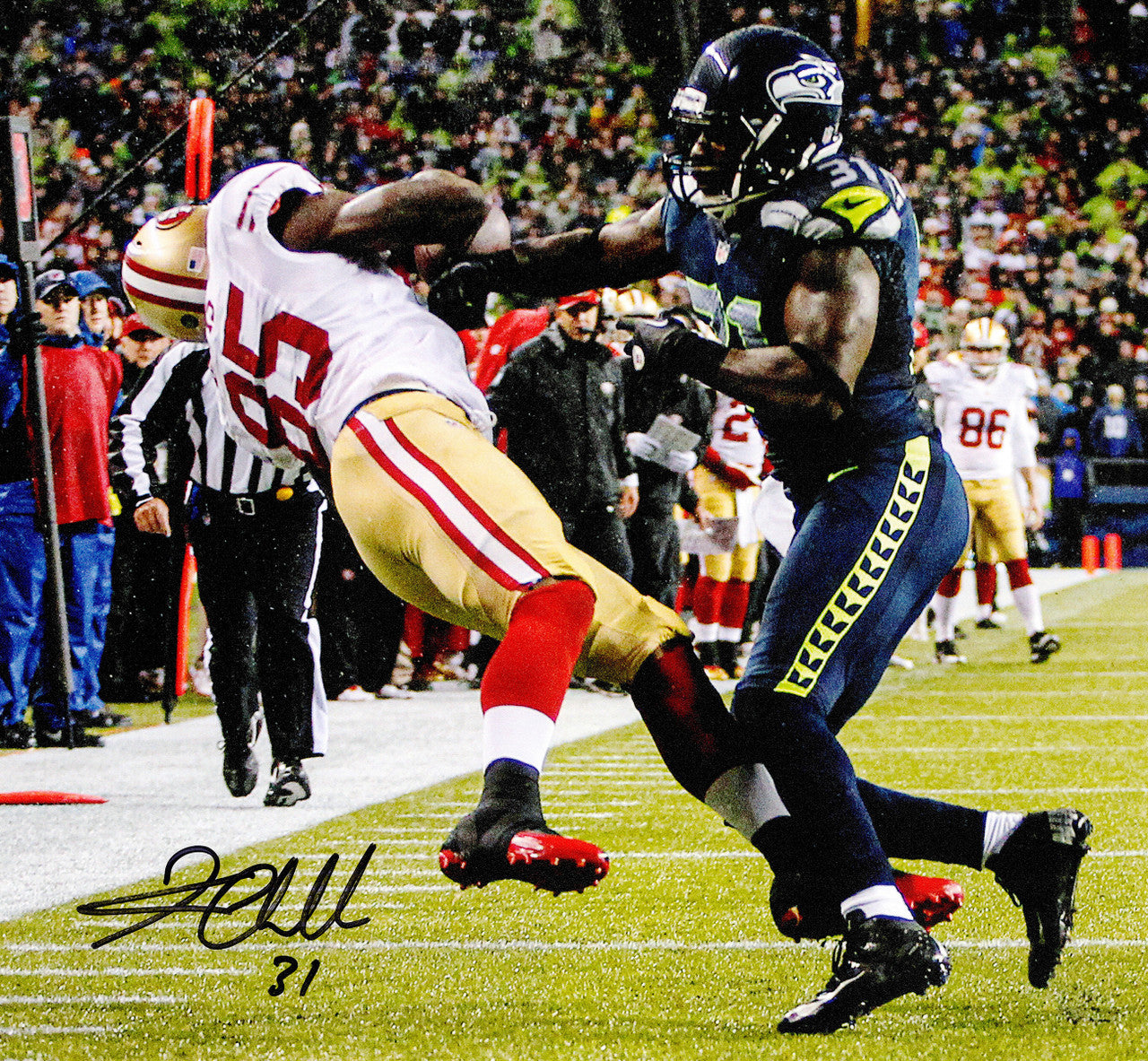 This is a 16x20 Photo (Hit On Vernon Davis) that has been hand signed by Kam Chancellor. This item has been witnessed and certified authentic by Beckett Authentication (BAS) and comes with their tamper-proof witness hologram.