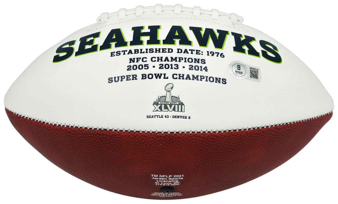 This is a White Seattle Seahawks Logo Football that has been hand signed by Kam Chancellor. This item has been witnessed and certified authentic by Beckett Authentication (BAS) and comes with their tamper-proof witness hologram.