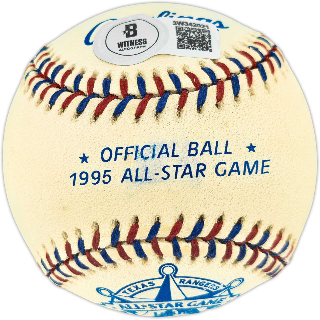 Own an iconic MLB collectible with this Ken Griffey Jr. Autographed Official 1995 All Star Game Logo Baseball Seattle Mariners Beckett BAS Witness #3W342021, authenticated by Beckett BAS Witness for verified legitimacy.