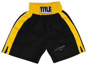 Michael Spinks signed Title black with gold trim boxing trunks with 'Jinx' inscription. Item comes with a Schwartz Sports Memorabilia tamper-proof numbered hologram and Certificate of Authenticity which can be verified online.