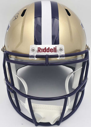 Celebrate one of the most explosive quarterbacks in recent college football history with this Michael Penix Jr. Autographed Washington Huskies Gold Full Size Riddell Speed Replica Helmet. Penix electrified the NCAA with his deep-ball accuracy, leadership, and ability to elevate Washington into a national title contender.