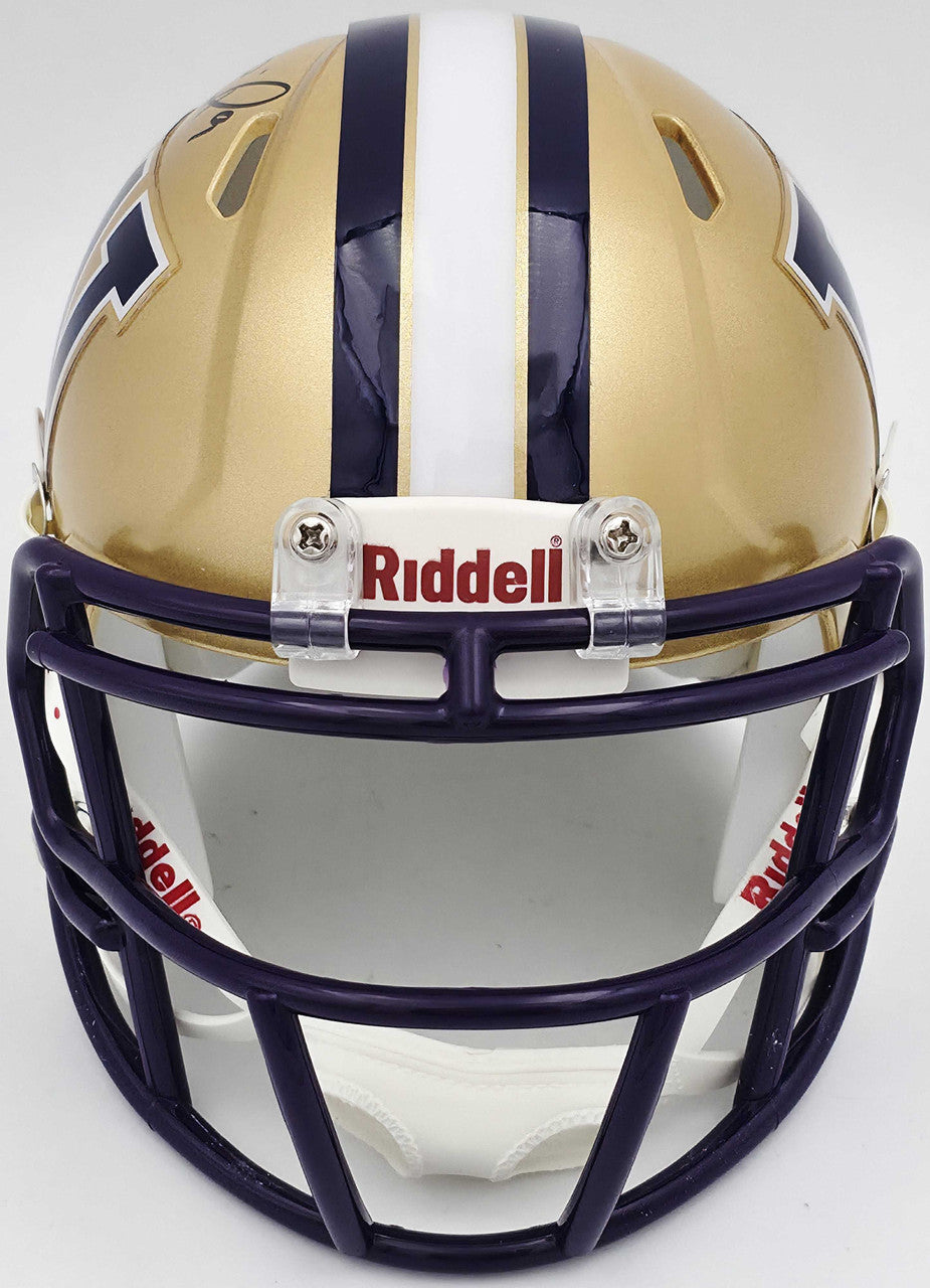 Add a standout college football collectible to your display with this Michael Penix Jr. Autographed Washington Huskies Gold Speed Mini Helmet. As one of the most dynamic quarterbacks in recent NCAA history, Penix’s signed items continue to surge in popularity among collectors and Huskies fans.