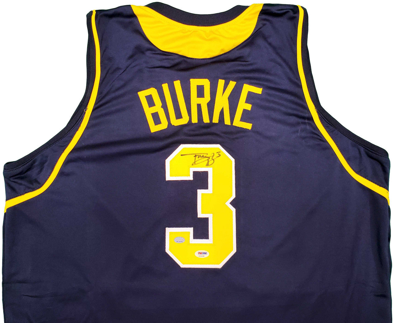 This is a Blue Jersey that has been hand signed by Trey Burke. This is a custom jersey with no name brand. The approximate size is XL. It has nice sewn in name and numbers. This item has been certified authentic by PSA/DNA and comes with their tamper-proof sticker and matching certificate of authenticity.