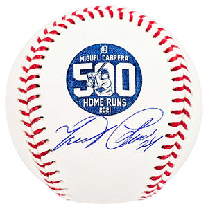 This Official MLB 500 Home Run logo baseball has been hand signed by Miguel Cabrera, the Detroit Tigers legend, two-time MVP, Triple Crown winner, and member of the elite 500 Home Run Club. Cabrera reached the historic 500 home run mark in 2021, solidifying his legacy as one of the greatest hitters in Major League Baseball history.