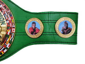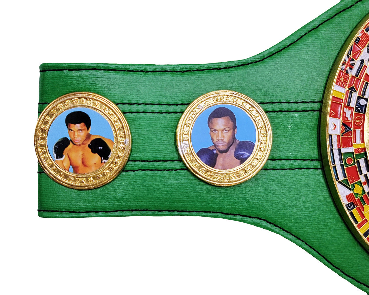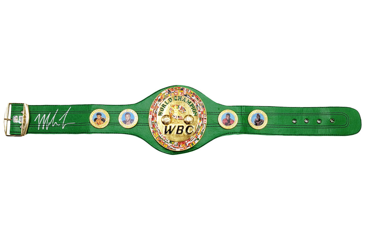 This stunning Green WBC World Championship Belt has been hand signed by Mike Tyson and features four iconic metal boxer plaques showcasing Mike Tyson, Muhammad Ali, Joe Frazier, and George Foreman—a tribute to the legends of heavyweight boxing. Tyson’s bold autograph elevates this belt into a true museum-quality centerpiece.