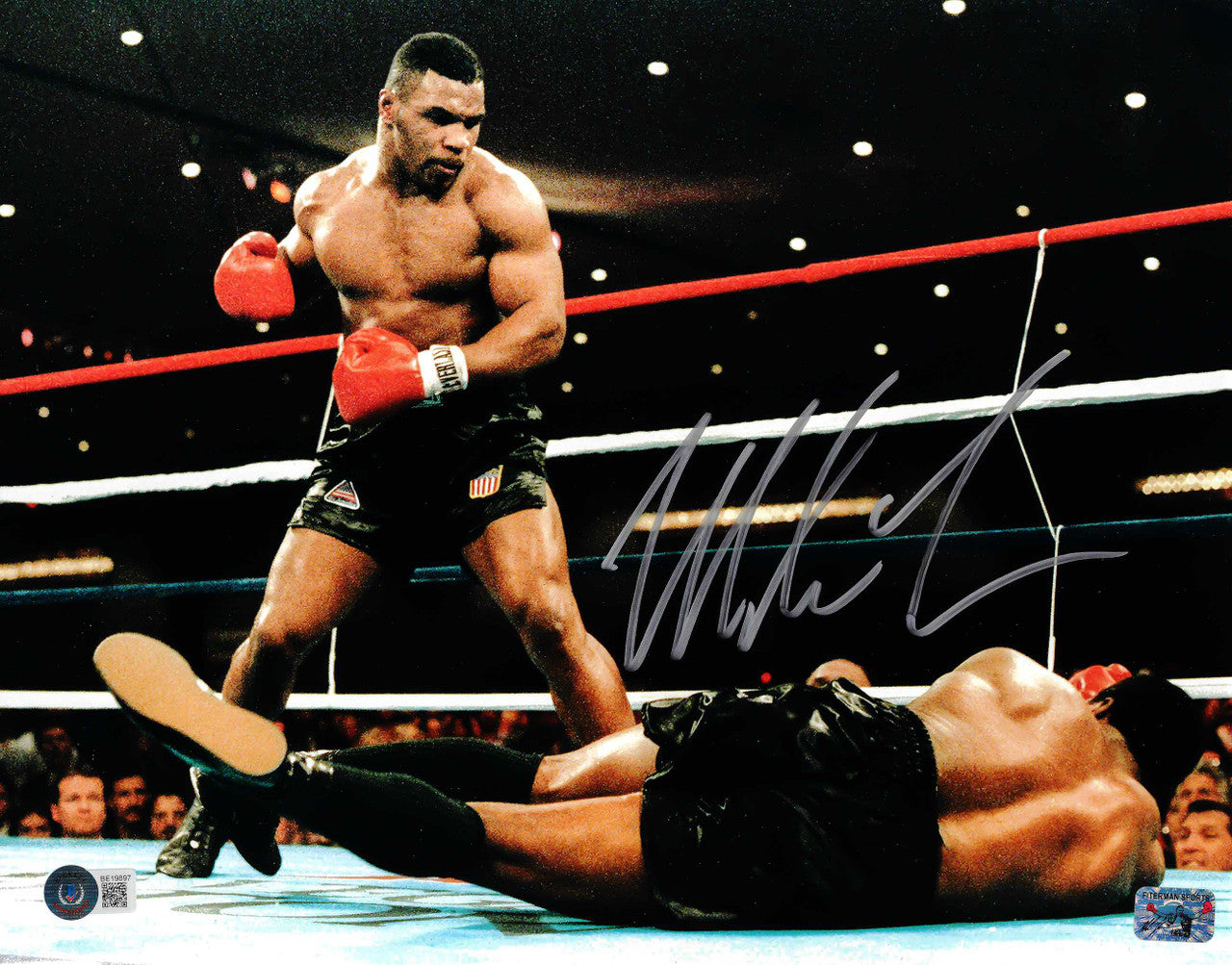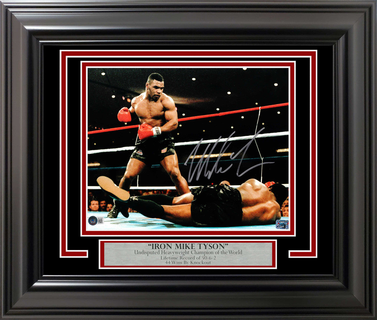 Add an iconic boxing collectible to your display with this Mike Tyson Autographed Framed 11x14 Photo Standing Over Trevor Berbick, authenticated by Beckett BAS QR.