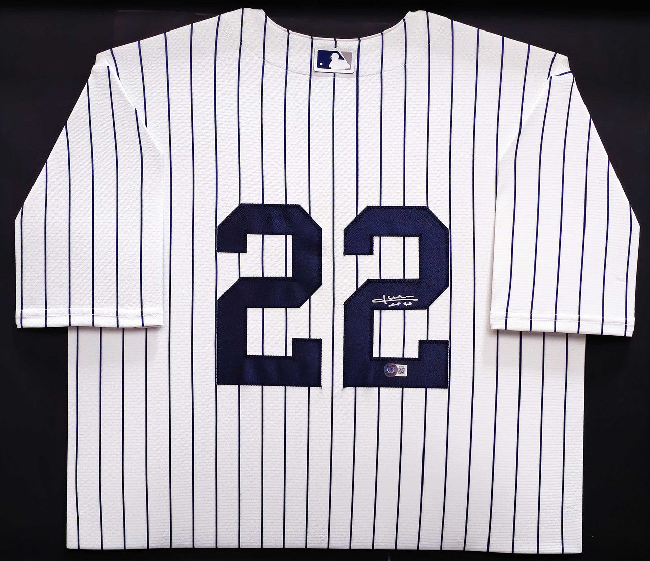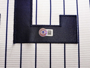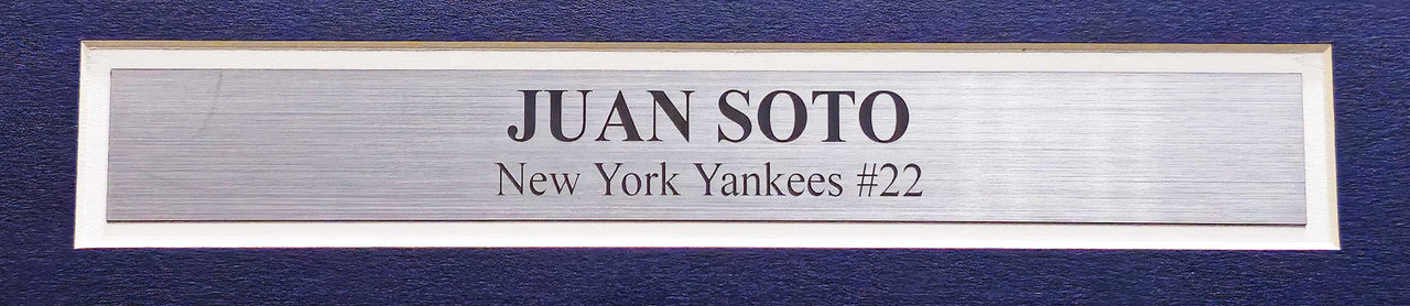 This is a framed White Pinstripes Nike New York Yankees Jersey, approximately 31x36 with the frame, that has been hand signed by Juan Soto. This jersey is Size XL. This item has been certified authentic by Beckett Authentication (BAS) and comes with their tamper-proof QR Code hologram that can be verified on beckett-authentication.com.