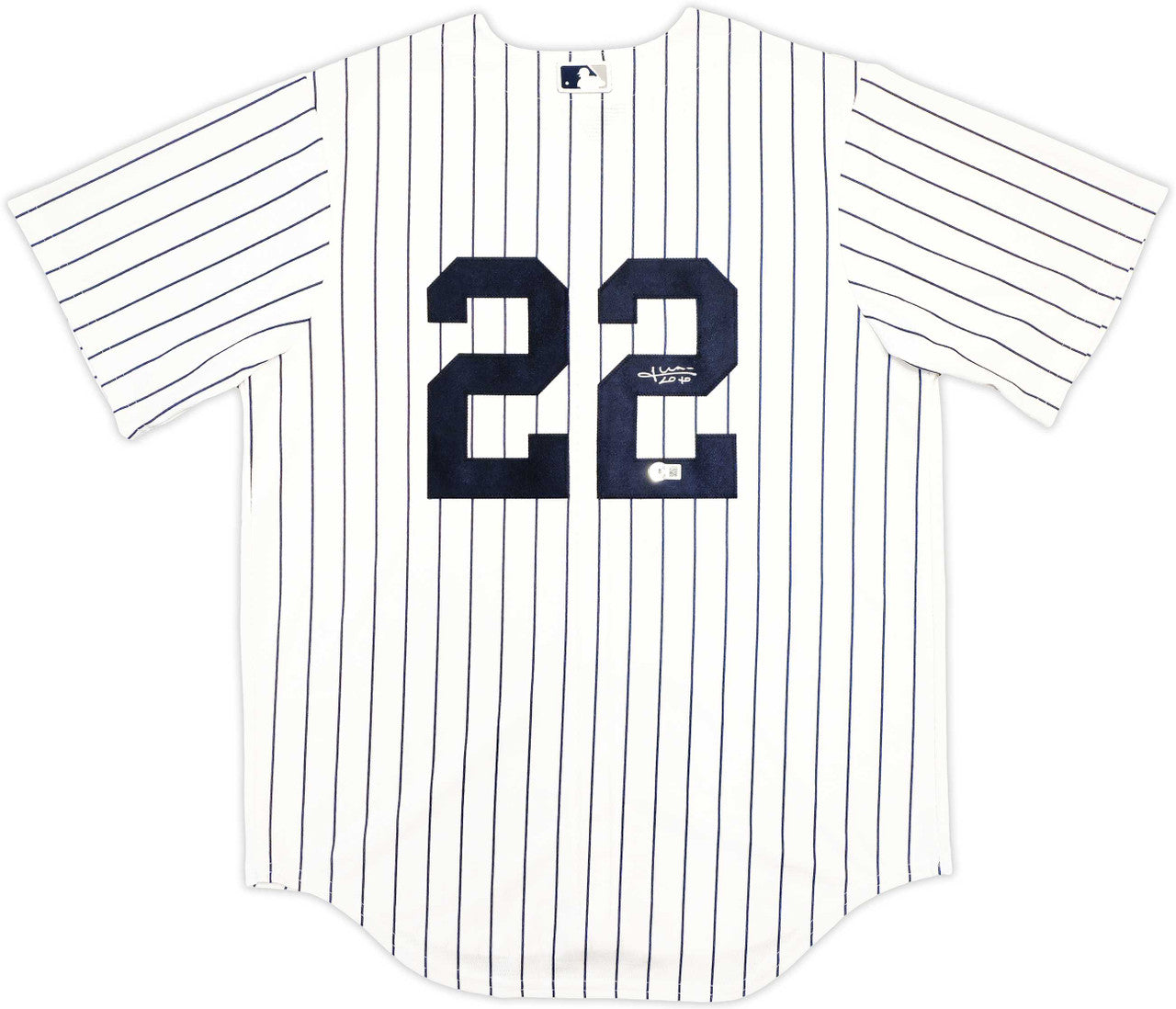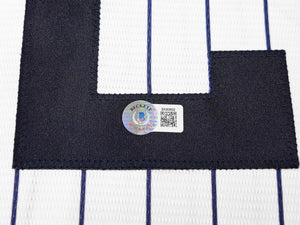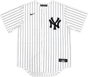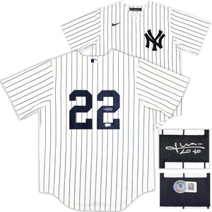 This is a White Pinstripes Nike New York Yankees Jersey that has been hand signed by Juan Soto. This jersey is Size L. This item has been certified authentic by Beckett Authentication (BAS) and comes with their tamper-proof QR Code sticker that can be verified on beckett-authentication.com.