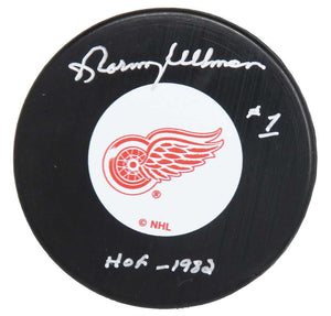 Norm Ullman signed Detroit Red Wings logo hockey puck with 'HOF 1982' inscription. Item comes with a Schwartz Sports Memorabilia tamper-proof numbered hologram and Certificate of Authenticity which can be verified online.