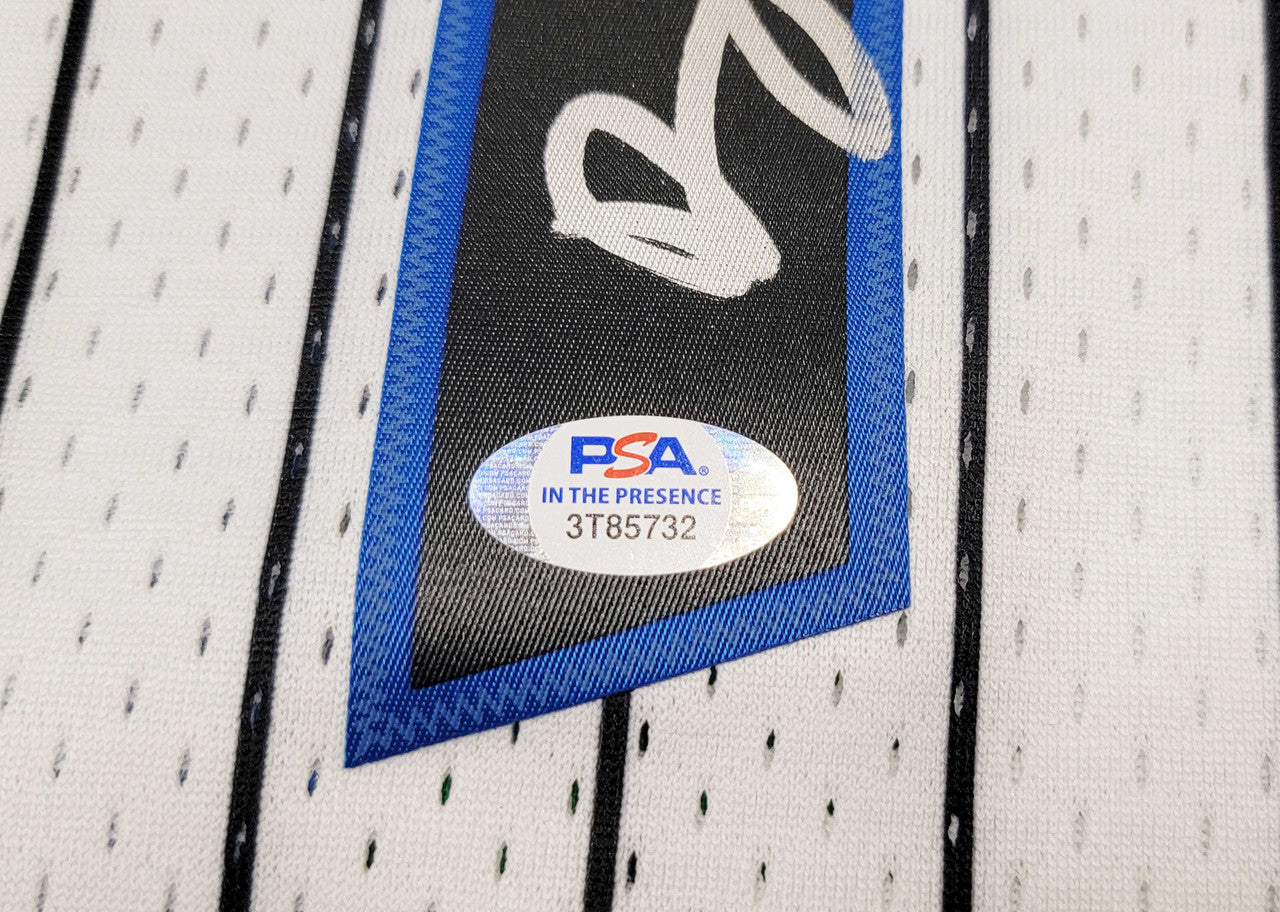 This jersey includes an official PSA/DNA tamper-proof hologram, which can be verified online to confirm the authenticity of Anfernee “Penny” Hardaway’s signature.
