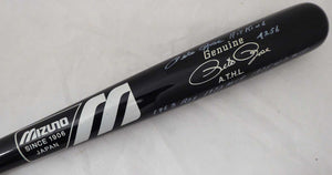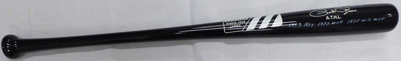 This is a Mizuno Bat that has been hand signed by Pete Rose. Pete inscribed this one; "Hit King, 4256, 1963 ROY, 1973 MVP, 1975 WS MVP." This item has the official tamper-proof Pete Rose hologram and matching certificate of authenticity.