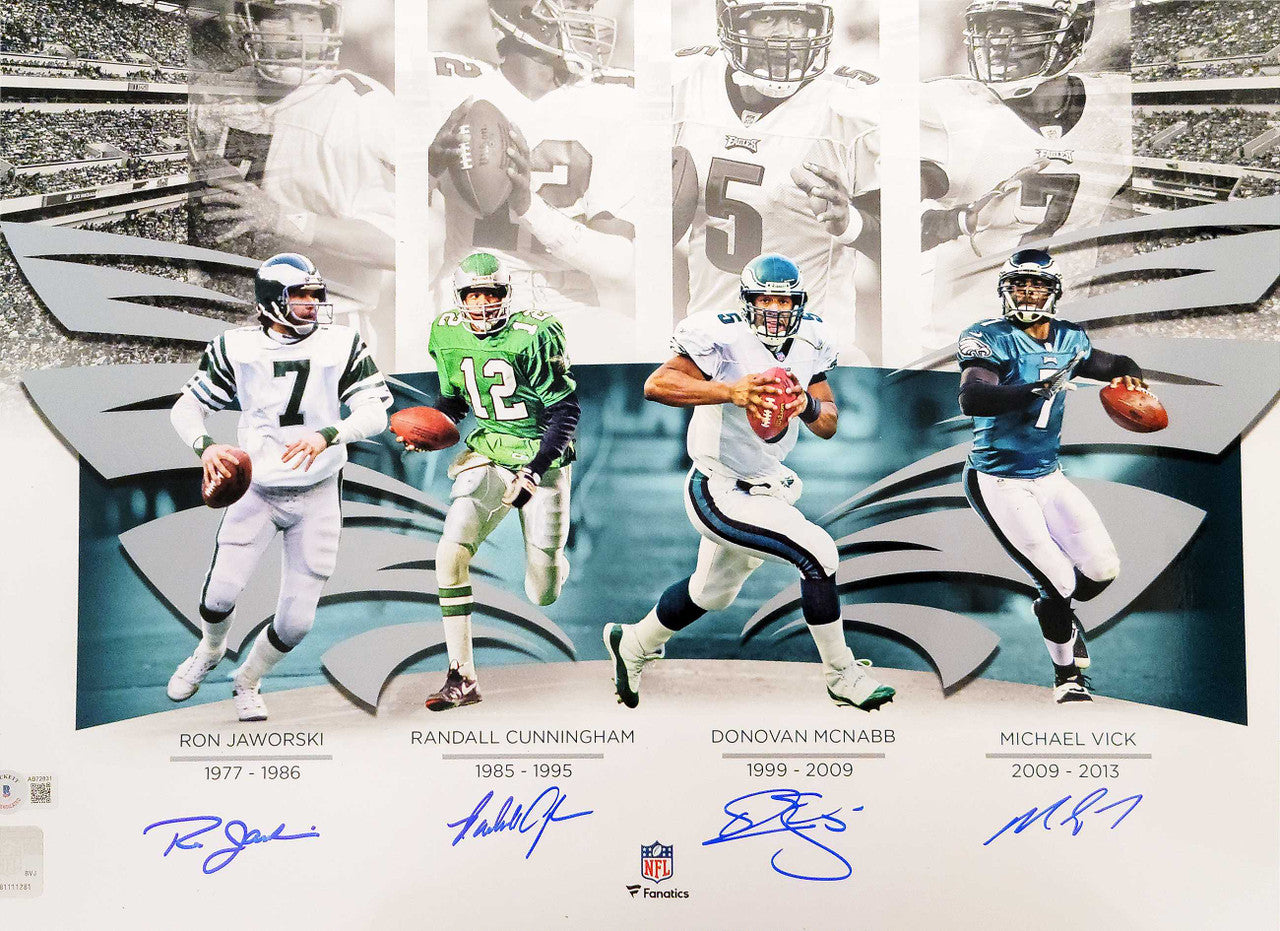 Philadelphia Eagles Quarterbacks Autographed 16x20 Photo With 4 Signatures Including Randall Cunningham & Donovan McNabb Beckett BAS