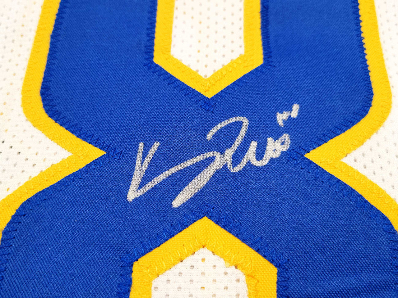 Celebrate the rise of a Pitt Panthers star quarterback with this Kenny Pickett Autographed Custom White Jersey. Pickett's unforgettable 2021 season, ACC Championship run, and “fake slide” highlight helped cement his legacy as one of the greatest quarterbacks in Pittsburgh history.