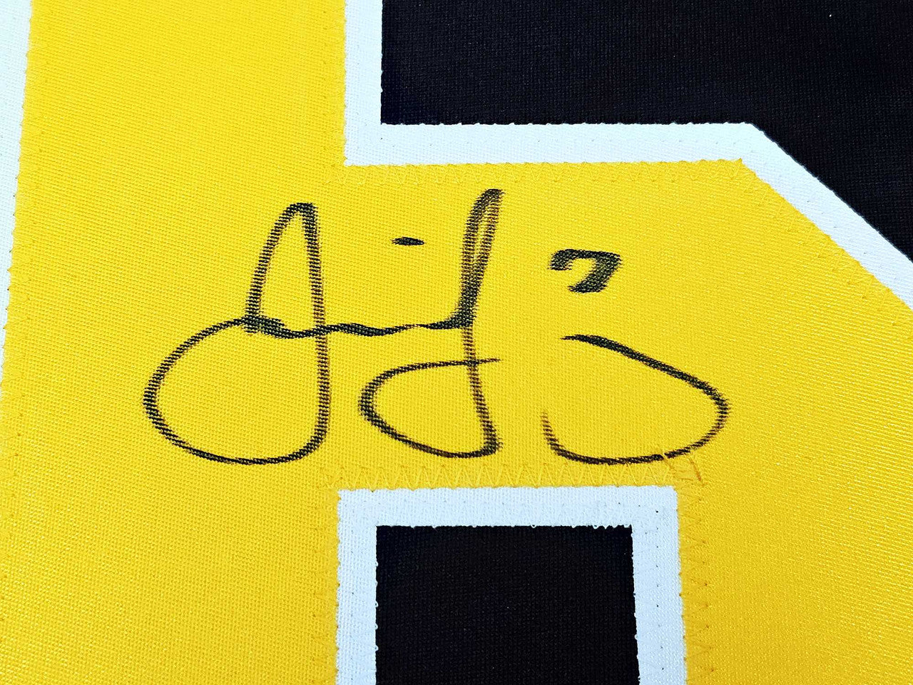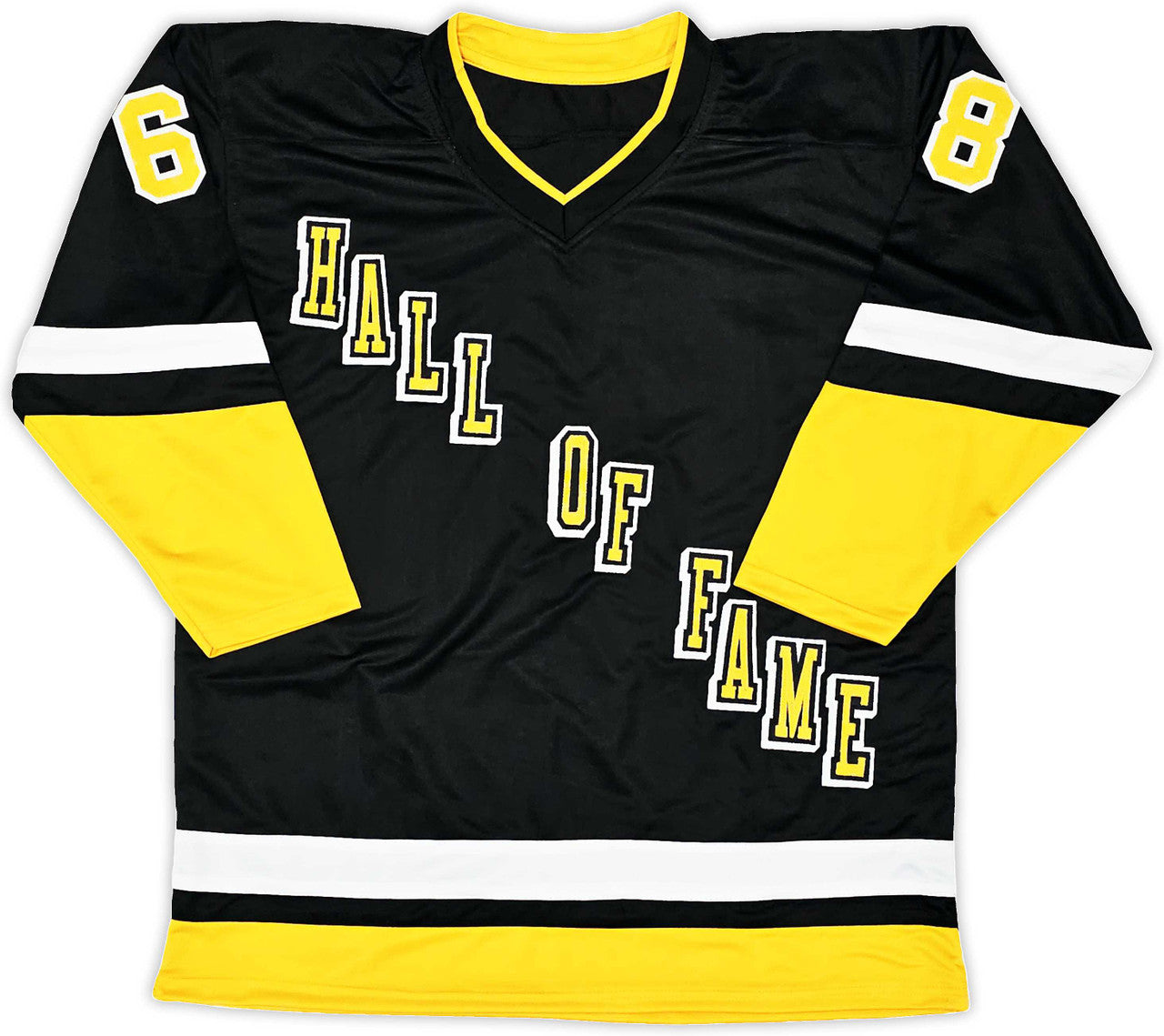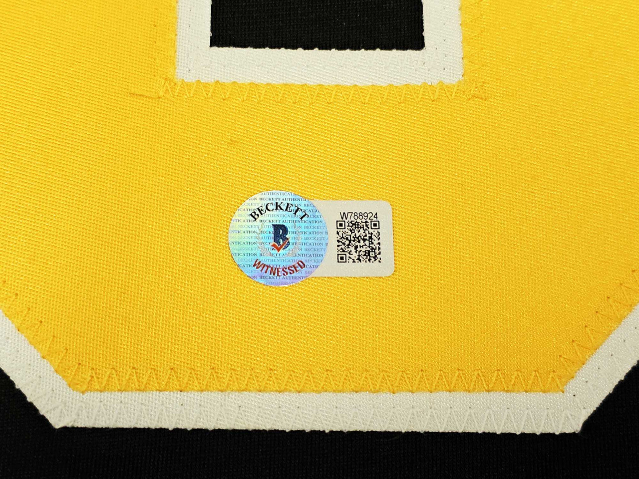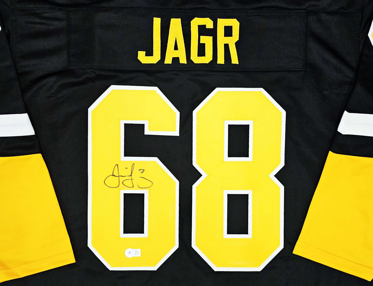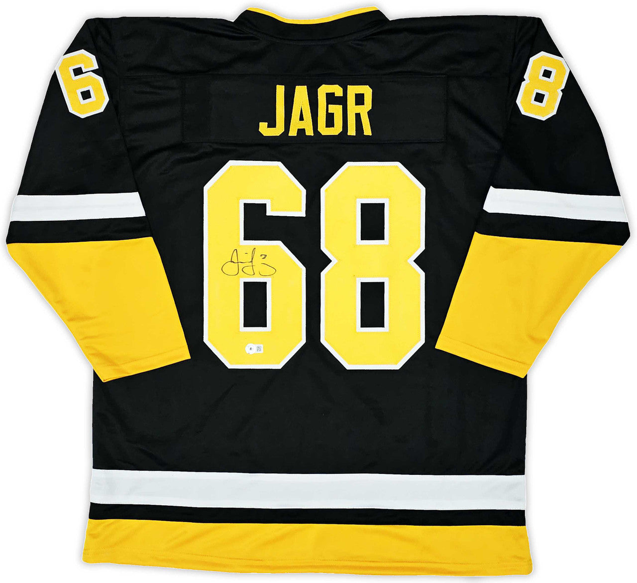 This is a Black & Yellow Jersey that has been hand signed by Jaromir Jagr. This is a custom jersey with no name brand. The approximate size is XL. It has nice sewn in name and numbers. This item has been witnessed and certified authentic by Beckett Authentication (BAS) and comes with their tamper-proof witness sticker.