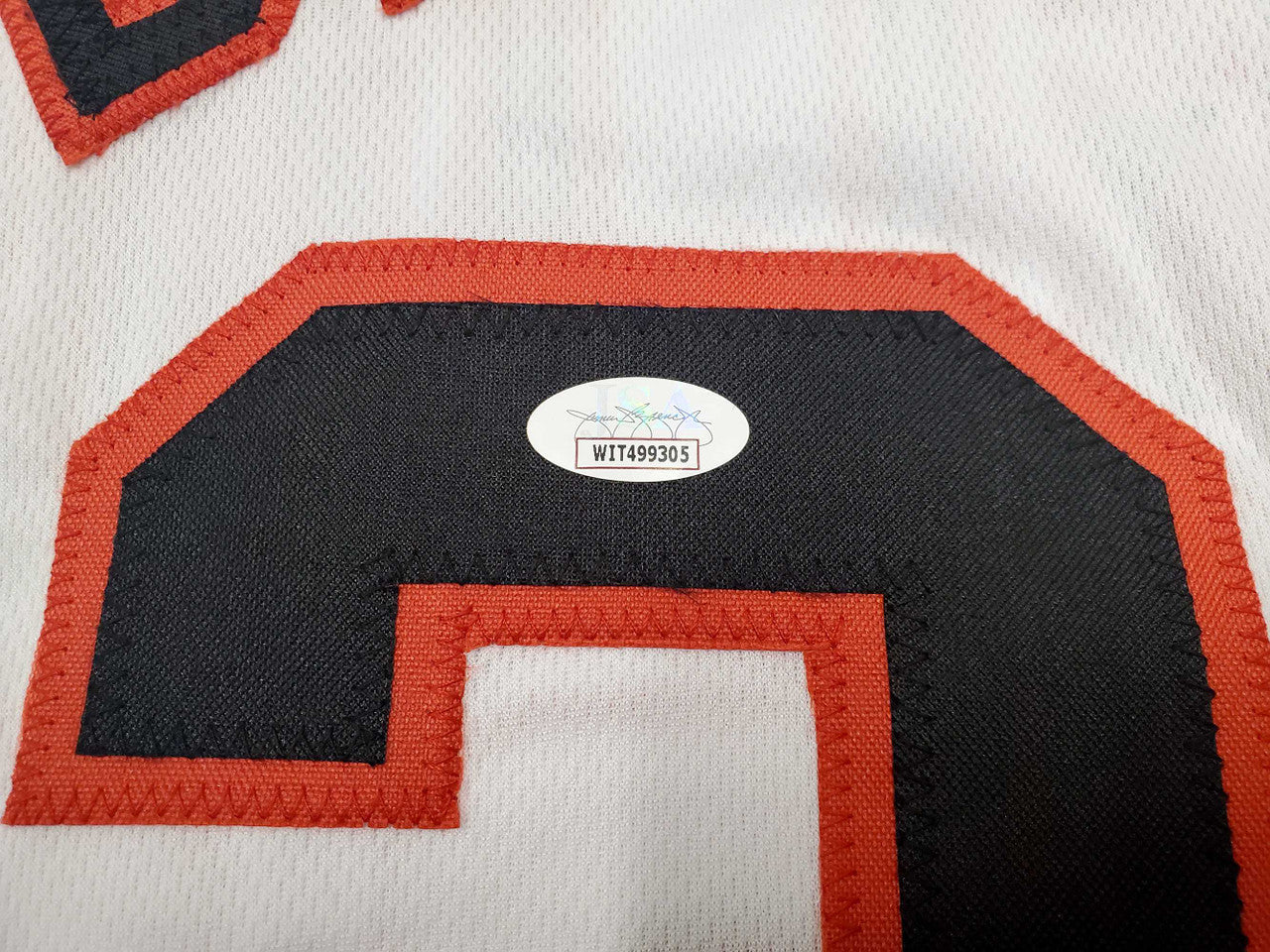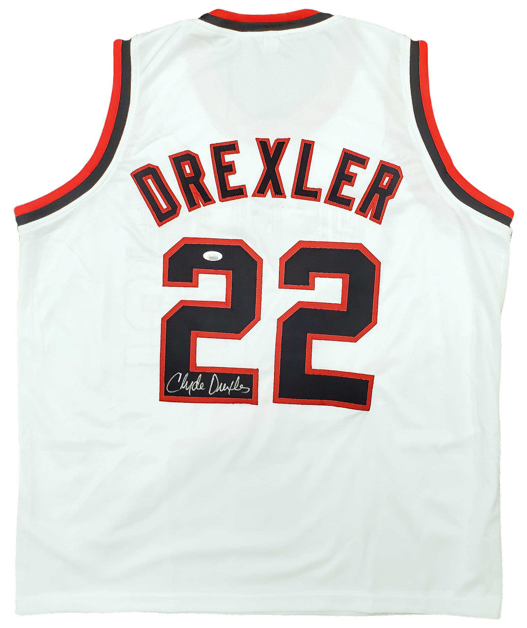 This is a White Jersey that has been hand signed by Clyde Drexler. This is a custom jersey with no name brand. The approximate size is XL. It has nice sewn in name and numbers. This item has been certified authentic by JSA and comes with their tamper-proof sticker and matching certificate of authenticity.