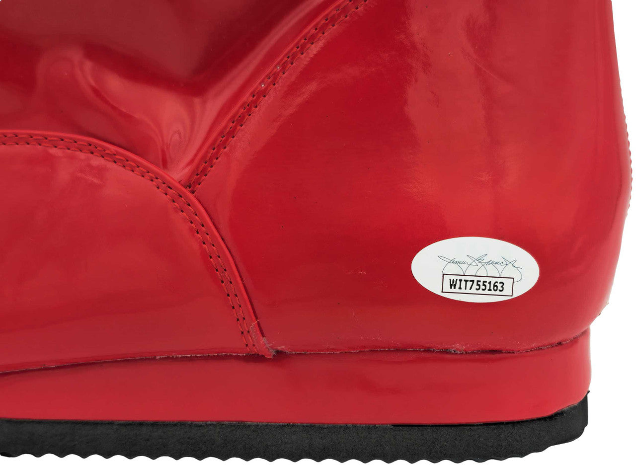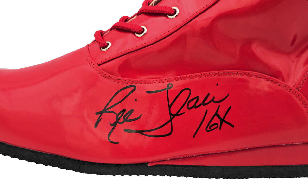 This is a Red Left Footed Boot/Shoe that has been hand signed by Ric Flair. This item was inscribed "16x." This item measures at 4"x12"x18" in size. This item has been certified authentic by JSA and comes with their tamper-proof sticker and matching certificate of authenticity.