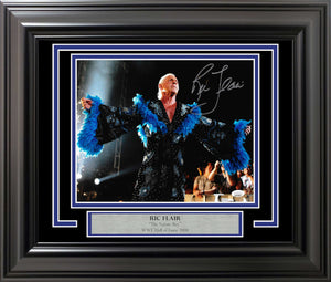 This stunning 11x14 photo, professionally framed to approximately 20x24 inches, features a bold Ric Flair signature prominently across the image. The high-quality frame arrives ready to hang, making it an immediate centerpiece for any wrestling collection, office, or fan cave.