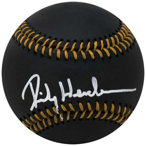 Rickey Henderson signed Rawlings black MLB baseball. Item comes with a Schwartz Sports Memorabilia tamper-proof numbered hologram and Certificate of Authenticity which can be verified online.