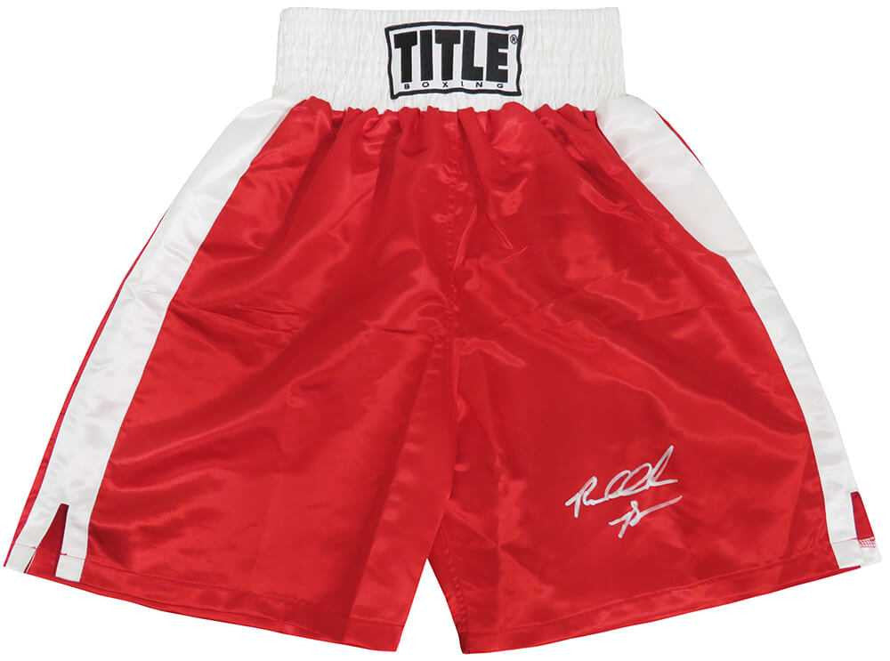 Riddick Bowe signed Title red with white trim boxing trunks. Item comes with a Schwartz Sports Memorabilia tamper-proof numbered hologram and Certificate of Authenticity which can be verified online.