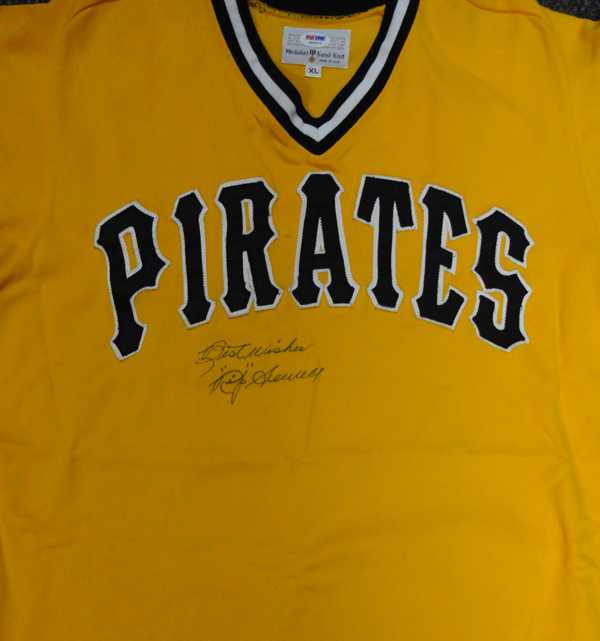 This is a Sand Knit Pittsburgh Pirates Jersey that has been hand signed by Rip Sewell. It has been certified authentic by PSA/DNA and comes with their sticker and matching full page certificate of authenticity. The jersey is a size XL.