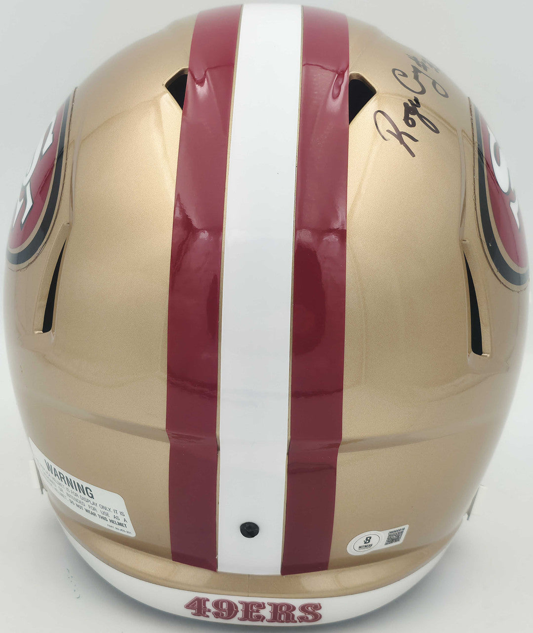 This officially licensed Riddell Speed Replica Helmet showcases the San Francisco 49ers gold shell with scarlet facemask and the classic “SF” logo decals. Each helmet is hand-signed by Roger Craig and authenticated under the Beckett Authentication Services (BAS) Witness Program, ensuring a Beckett representative personally observed the signing.