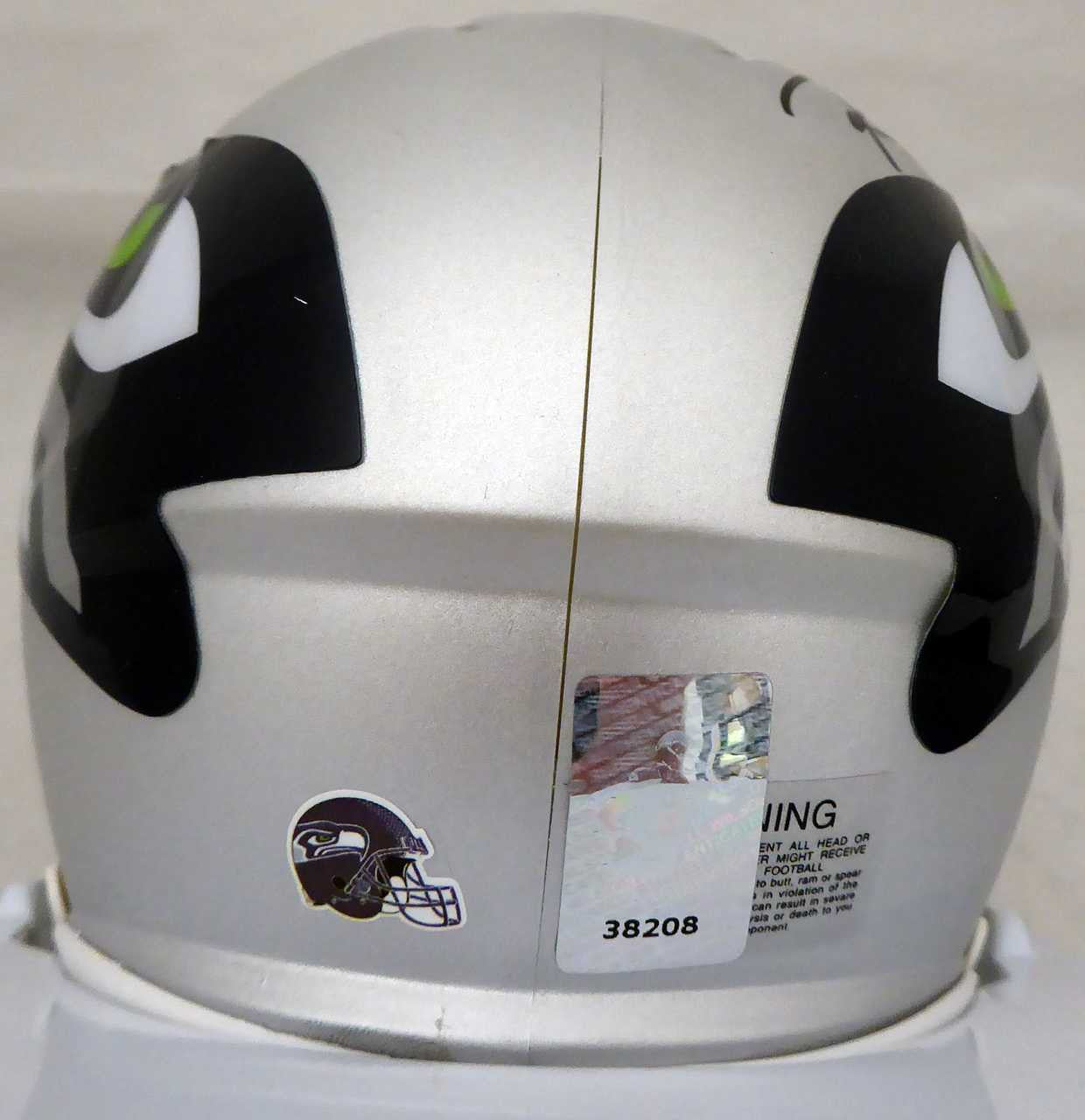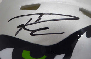 This is an AMP Seattle Seahawks Speed Mini Helmet that has been hand signed by Russell Wilson. This item has the official tamper-proof Russell Wilson serial numbered hologram and matching certificate of authenticity.