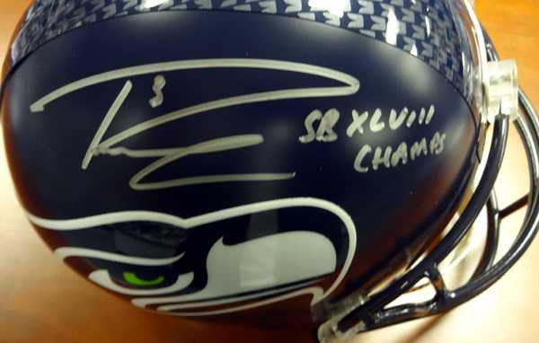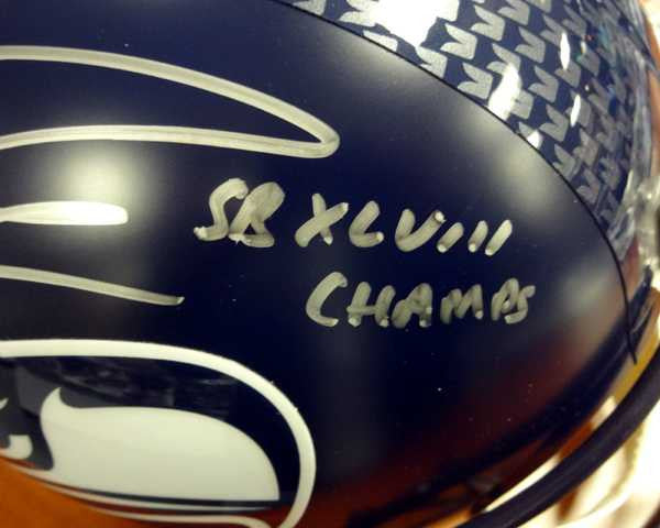 Russell Wilson Autographed Seattle Seahawks Full Size Helmet SB XLVIII Champs in Silver RW Holo