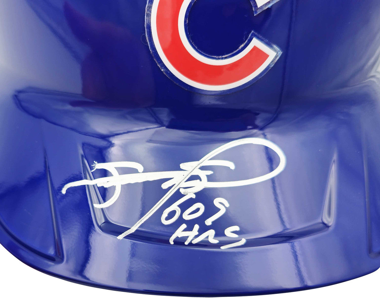 This stunning Full-Size Mach Pro Replica Batting Helmet features the classic Chicago Cubs blue finish with the bold “C” logo displayed prominently on the front. Sosa’s autograph and "609 HR" inscription stand out beautifully on the helmet crown, creating a premium display piece.